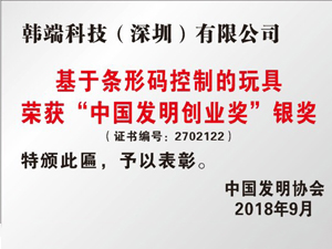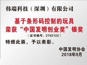 條形碼控制玩具榮獲中國發明創業獎--銀獎