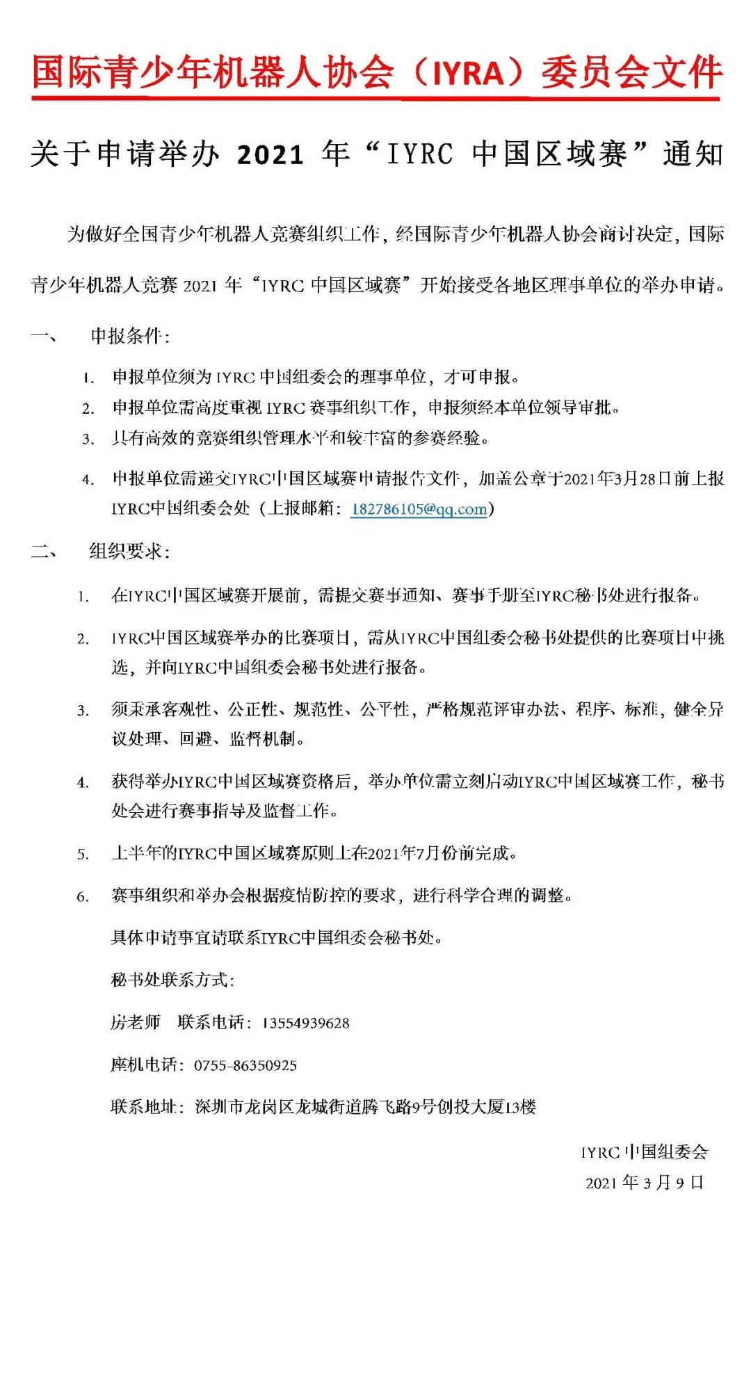 關(guān)于申請舉辦2021年“IYRC中國區(qū)域賽”通知
