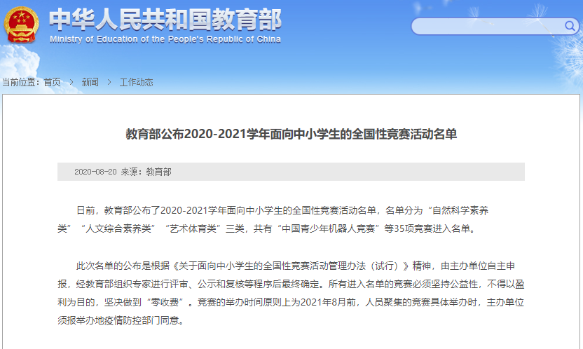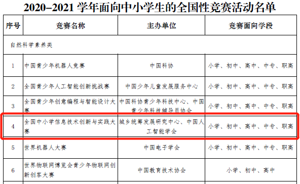 教育部公布的2020-2021學年面向中小學生的全國性競賽活動名單,名單分為“自然科學素養類”“人文綜合素養類”“藝術體育類”三類,共有“中國青少年機器人競賽、全國青少年人工智能創新挑戰賽、全國中小學信息技術創新與實踐大賽(NOC)”等35項競賽進入該名單。