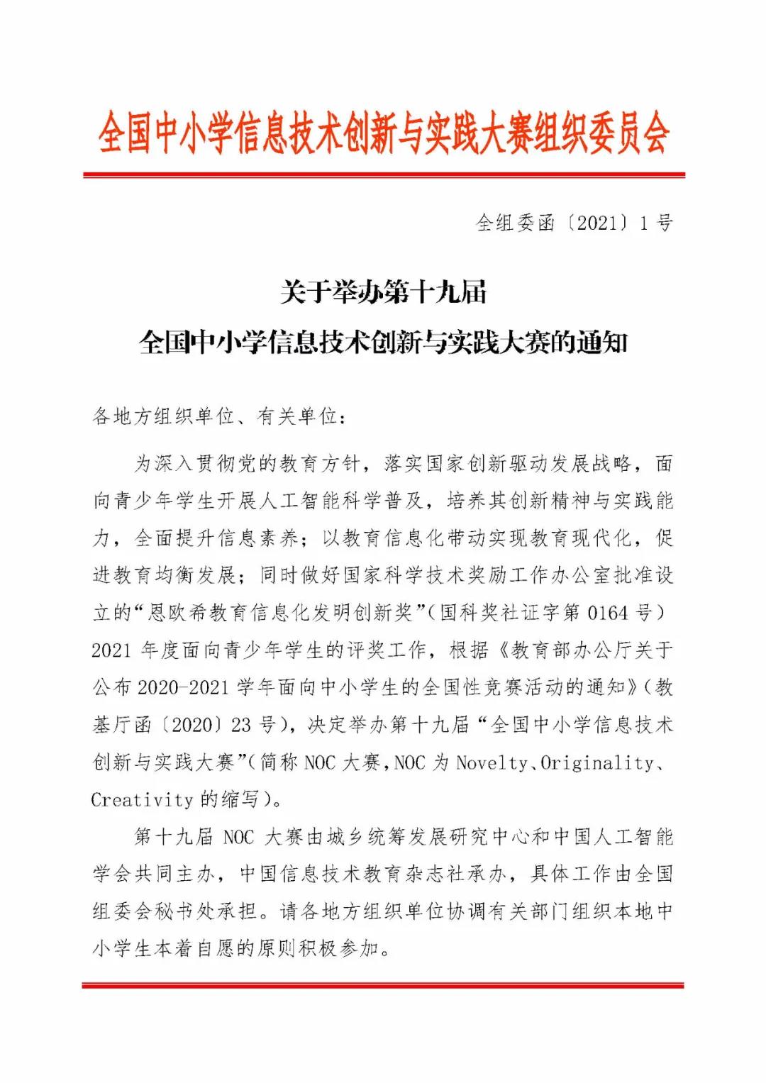 “全國中小學信息技術創新與實踐大賽”是一項運用信息技術,培養廣大師生的創新精神和實踐能力,面向青少年學生開展人工智能科學普及、引領科技創新的素質教育實踐平臺,簡稱NOC大賽(NOC為Novelty, Originality, Creativity的縮寫)。