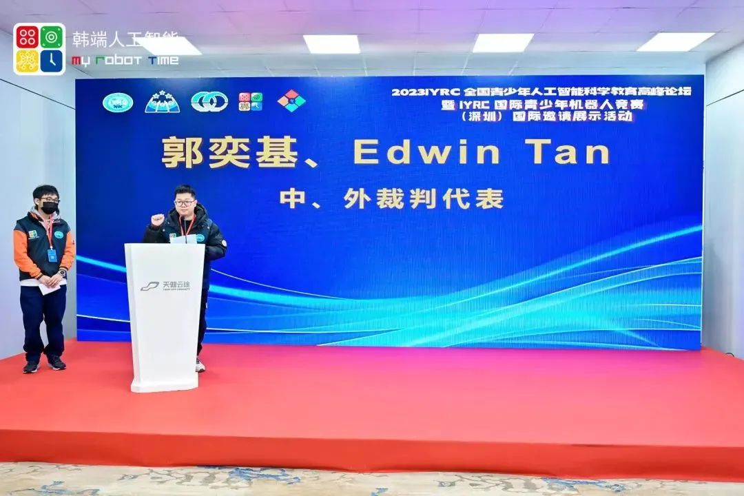 2023IYRC國際青少年機器人競賽(深圳)國際邀請展示活動上,中外裁判代表、中外選手代表首先分別用中英文進行了活動宣誓。