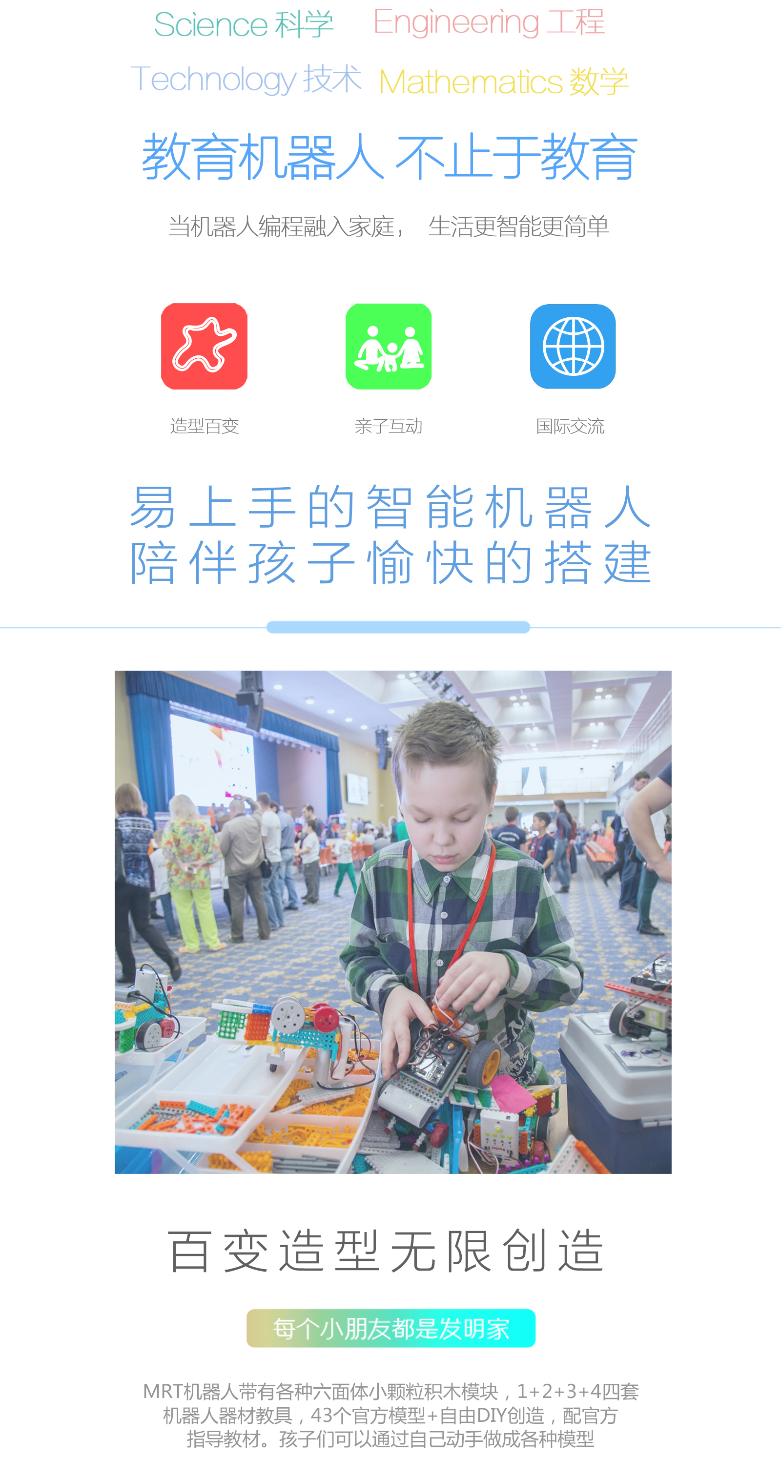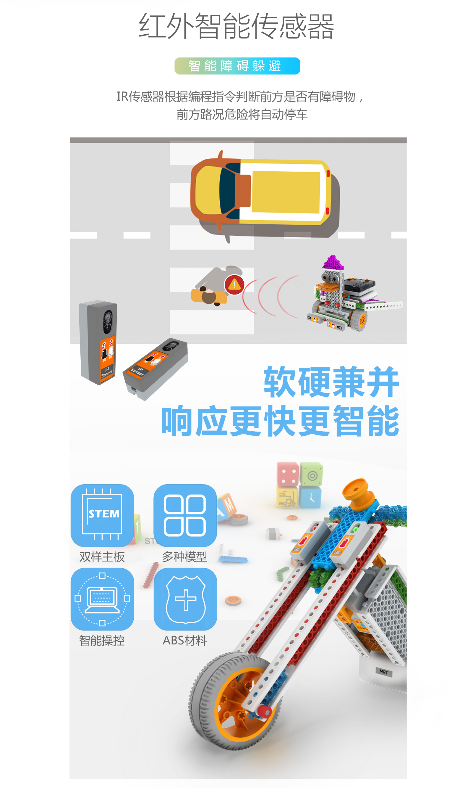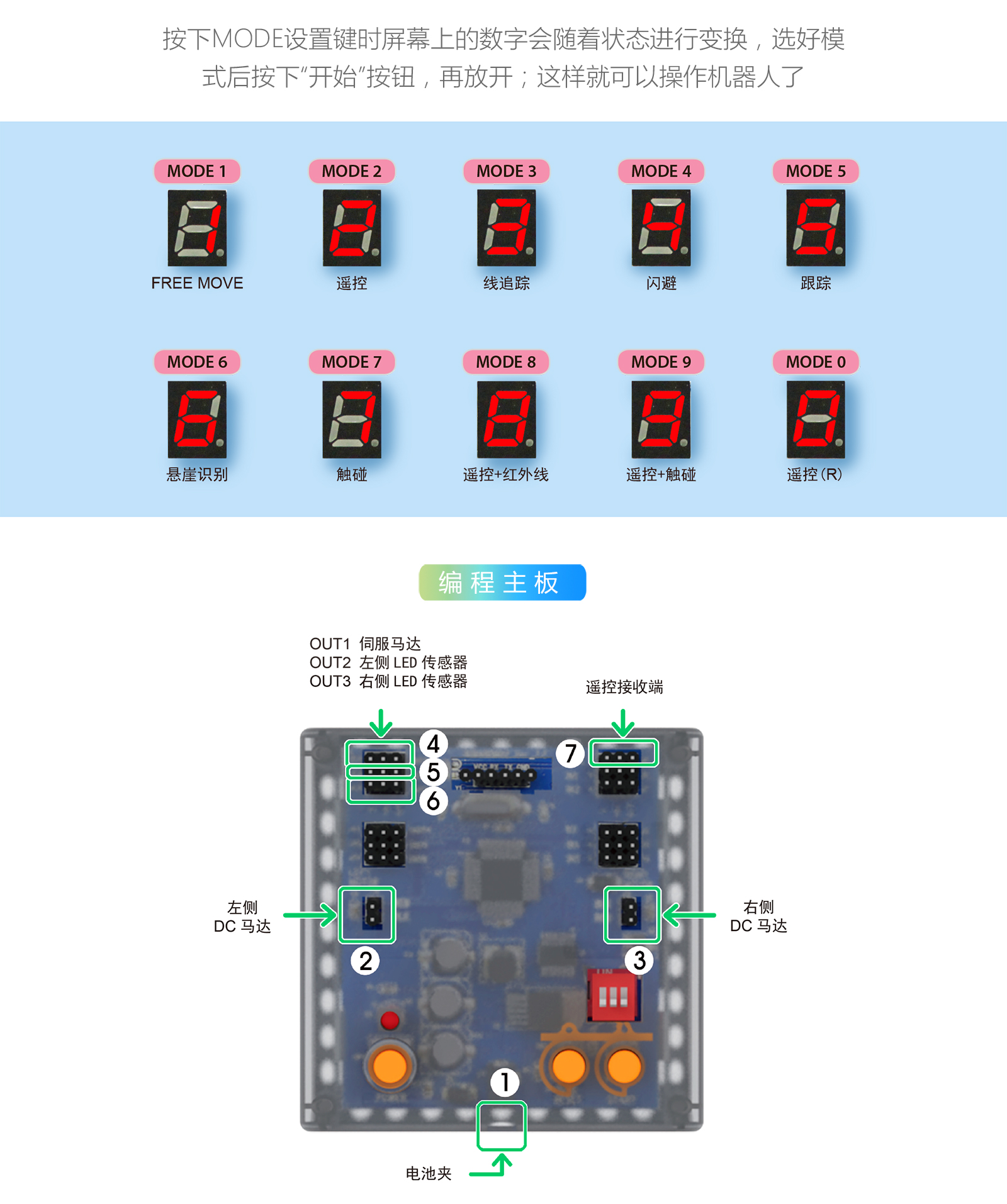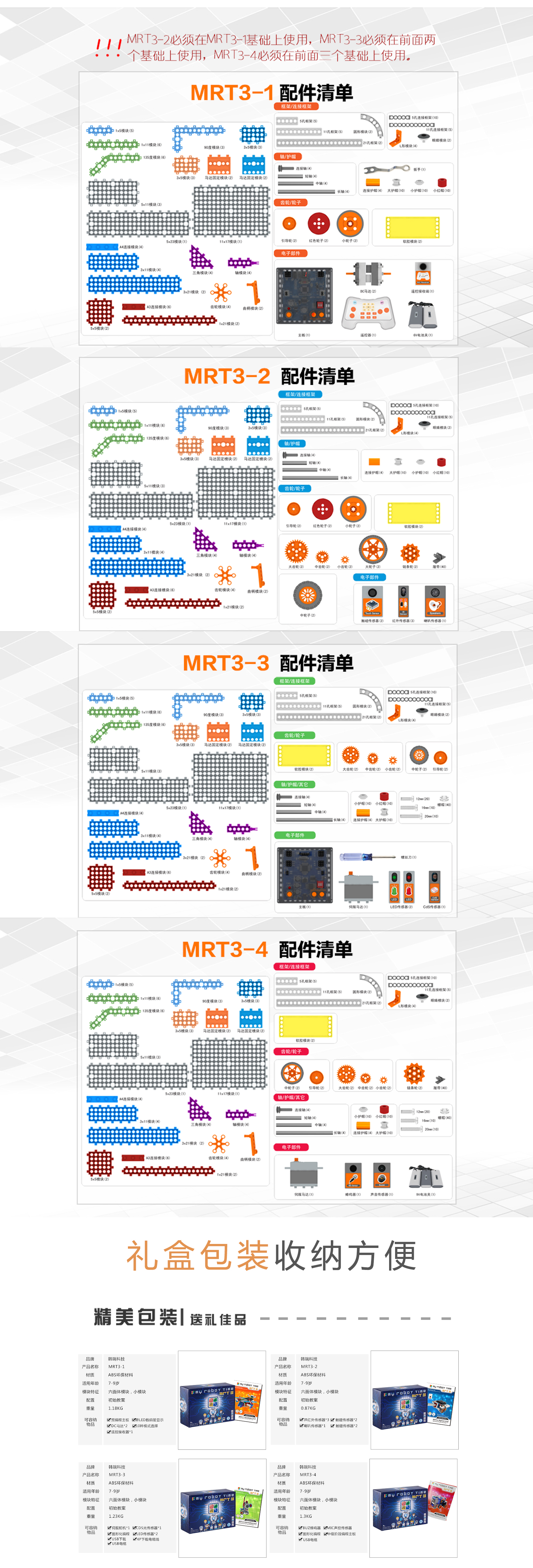 產(chǎn)品參數(shù) 產(chǎn)品名稱:MRT3-1 外觀顏色:多彩積木 產(chǎn)品材料:ABS環(huán)保材料 模塊特性:六面體模塊,小模塊 電 機(jī):DC馬達(dá)*2 主 板:預(yù)編程主板,帶LED數(shù)碼管顯示,10種模式選擇,2個電機(jī)接口,3個輸入 口,3個輸出口 傳 感 器:遙控接收器*1 模型數(shù)量:15個(10個動態(tài)+5個靜態(tài)) 額定電壓:6V (5號電池4節(jié)) 功 能:DIY 教學(xué),主板為單片機(jī)控制模式,程序已設(shè)置完畢,可設(shè)置模式,帶遙控器控制。 適用年齡:7-9歲 重 量:1.18KG 配 置:初始教案(英文) 包裝尺寸:寬220*厚280*高90mm 彩盒包裝