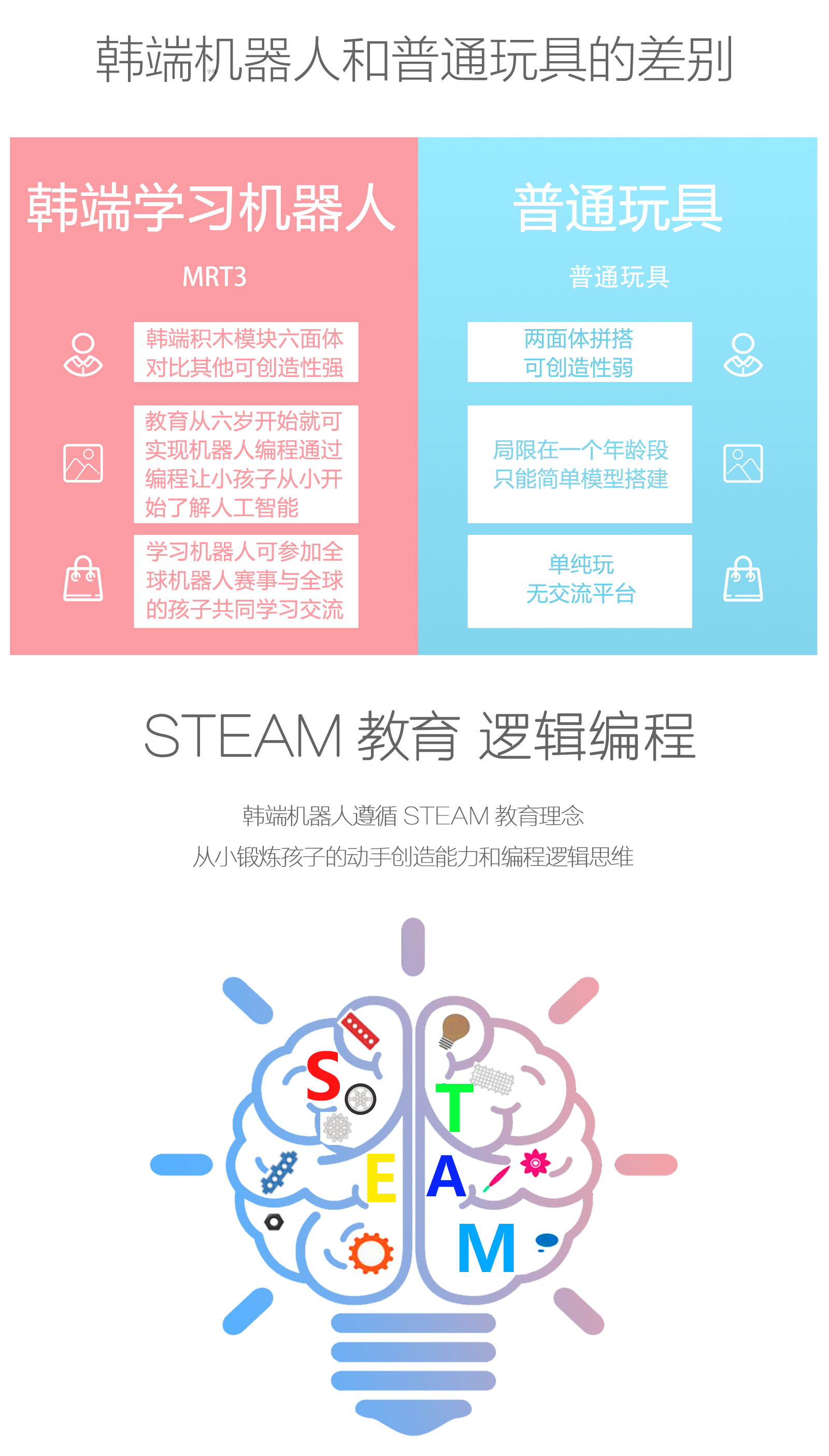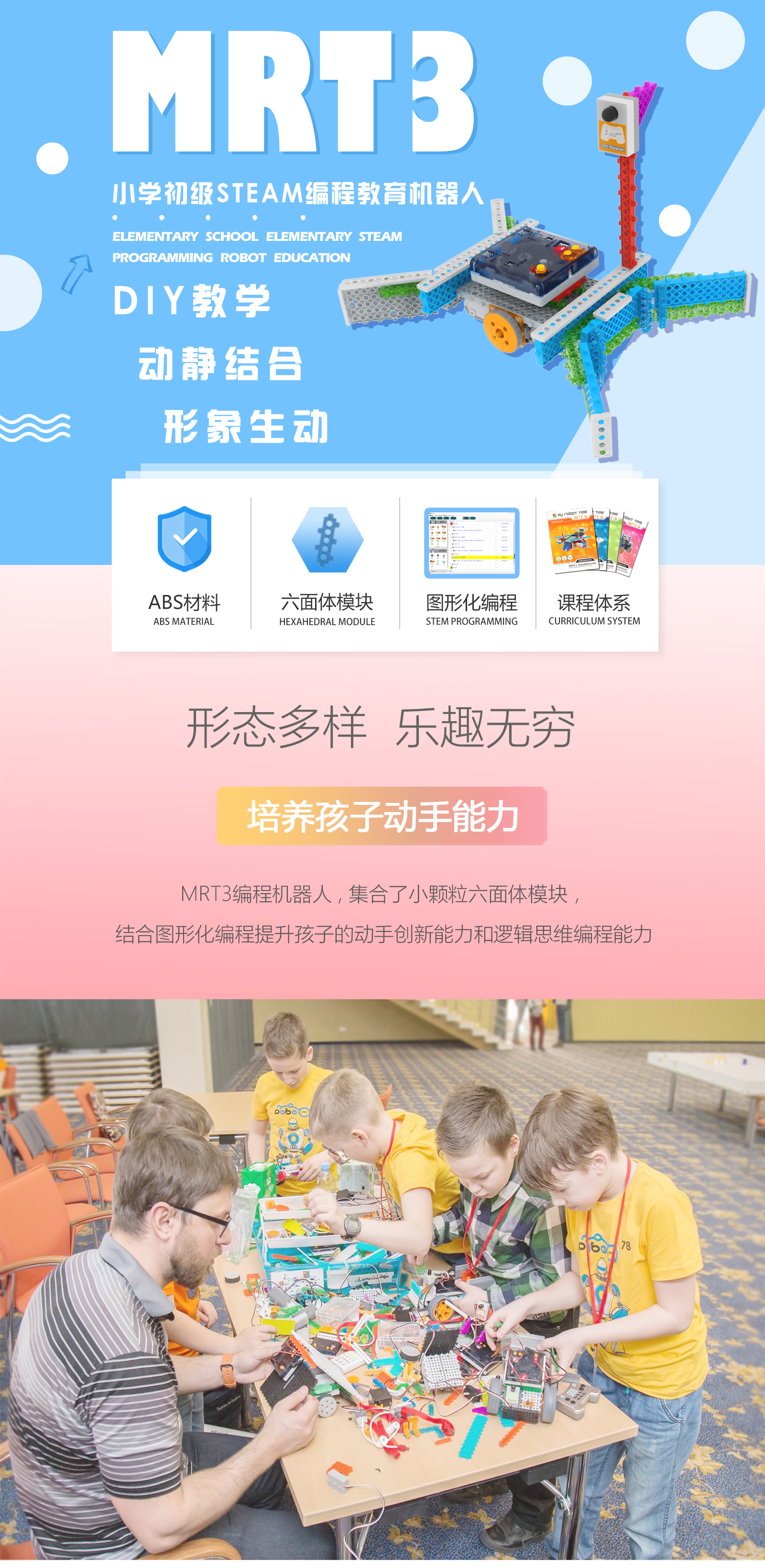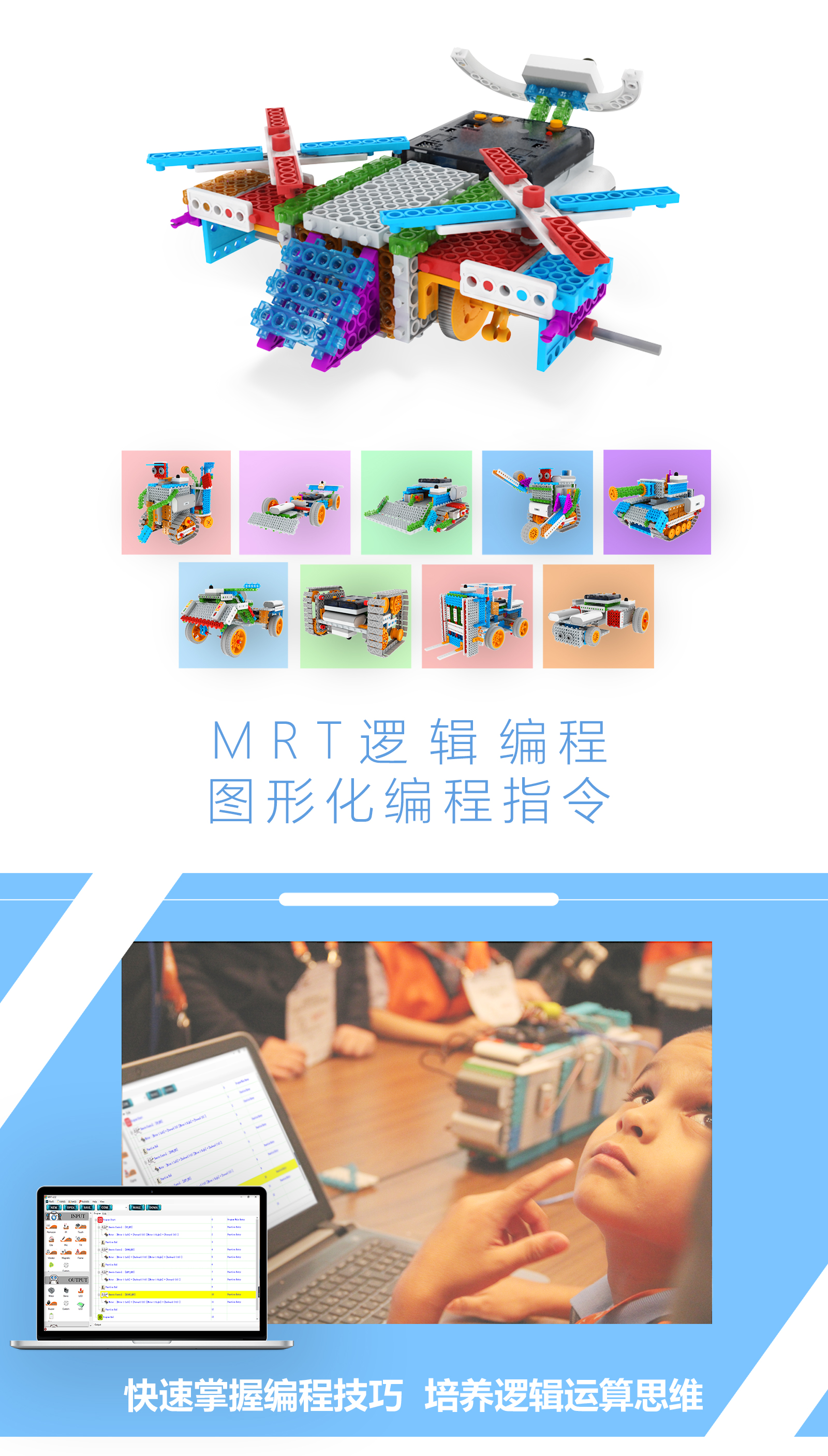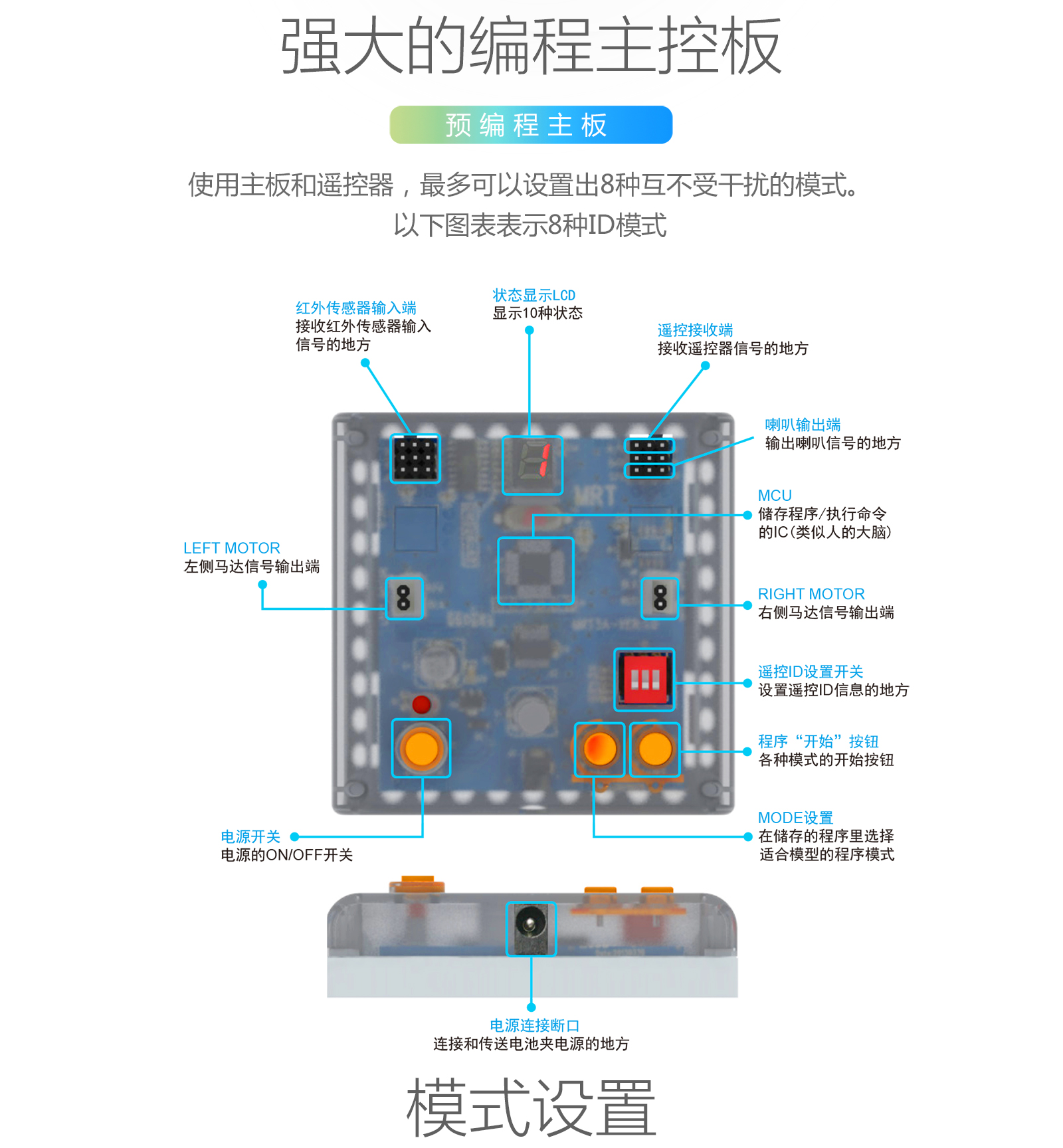 產(chǎn)品參數(shù) 產(chǎn)品名稱:MRT3-1 外觀顏色:多彩積木 產(chǎn)品材料:ABS環(huán)保材料 模塊特性:六面體模塊,小模塊 電 機(jī):DC馬達(dá)*2 主 板:預(yù)編程主板,帶LED數(shù)碼管顯示,10種模式選擇,2個電機(jī)接口,3個輸入 口,3個輸出口 傳 感 器:遙控接收器*1 模型數(shù)量:15個(10個動態(tài)+5個靜態(tài)) 額定電壓:6V (5號電池4節(jié)) 功 能:DIY 教學(xué),主板為單片機(jī)控制模式,程序已設(shè)置完畢,可設(shè)置模式,帶遙控器控制。 適用年齡:7-9歲 重 量:1.18KG 配 置:初始教案(英文) 包裝尺寸:寬220*厚280*高90mm 彩盒包裝